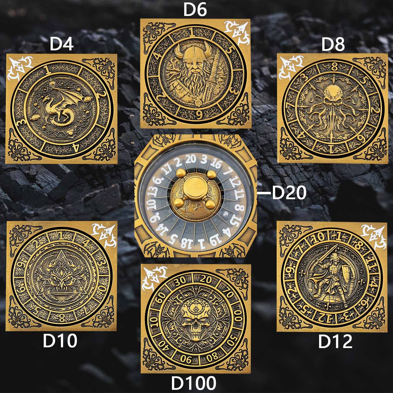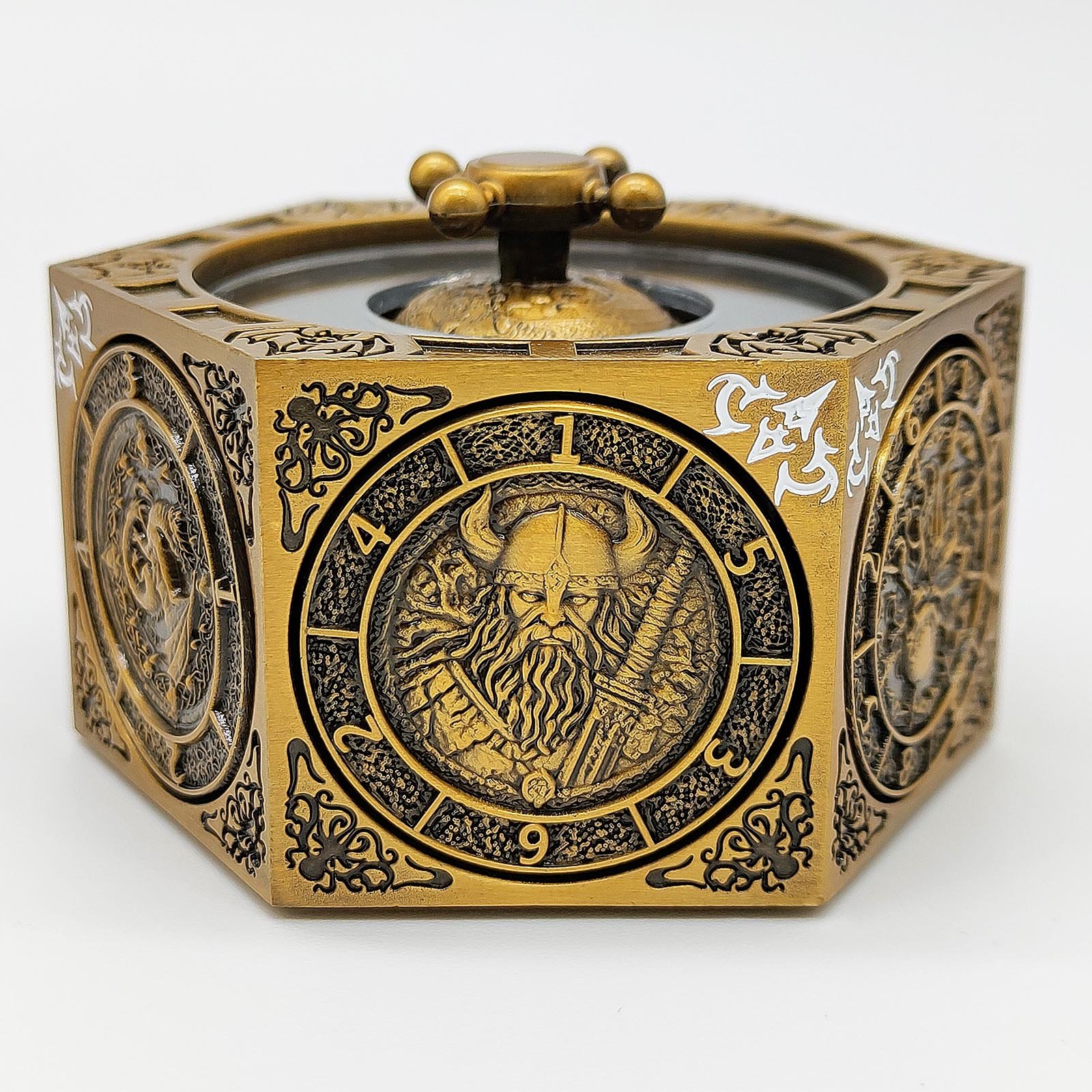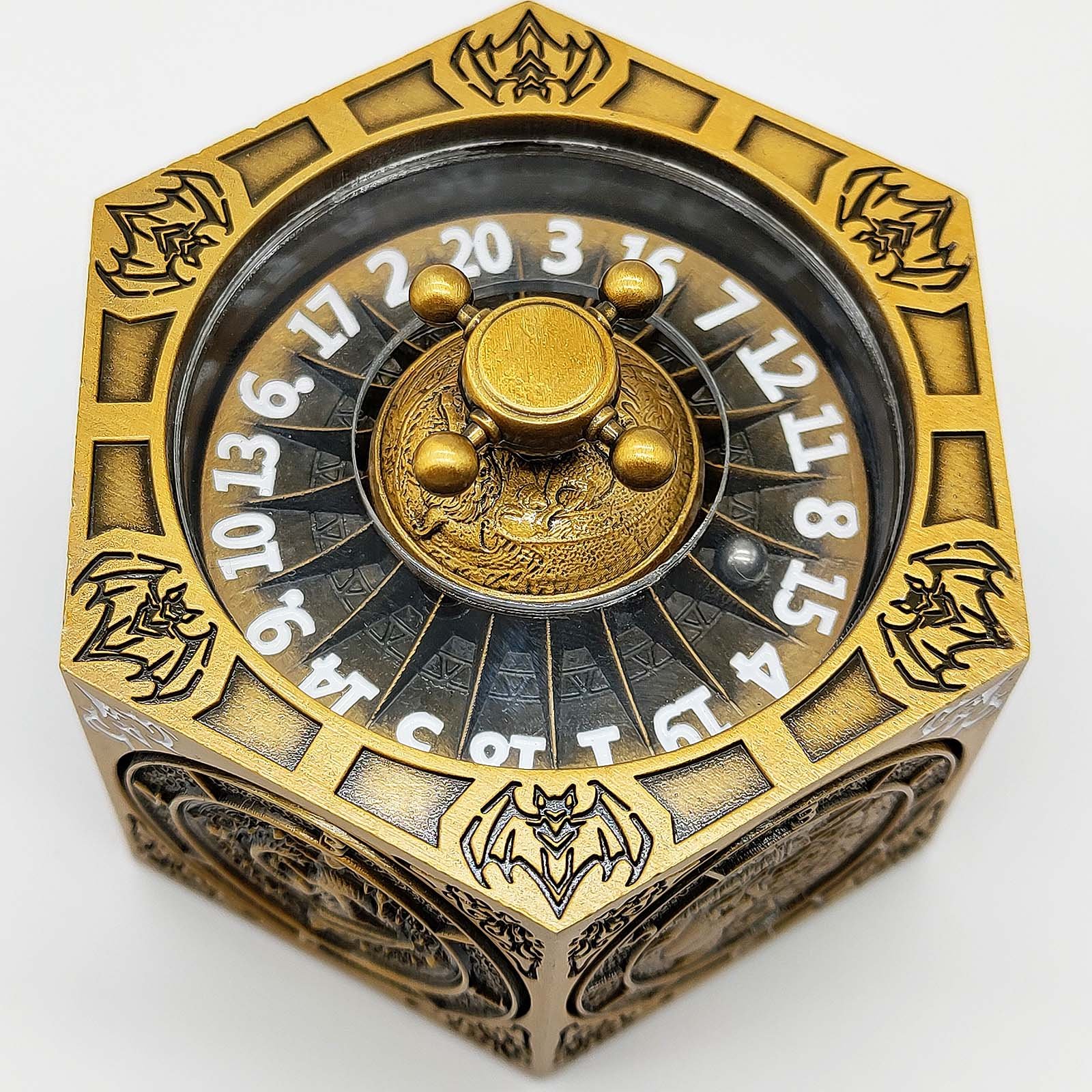 The Ancient Gold Mechanical Spinner Dice is a legendary artifact for your D&D or Pathfinder sessions. The hand-polished, vintage gold finish highlights every micro-detail of the 3D reliefs, making it the perfect centerpiece for any collector.