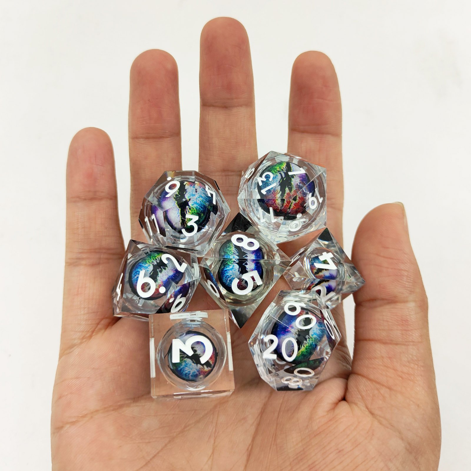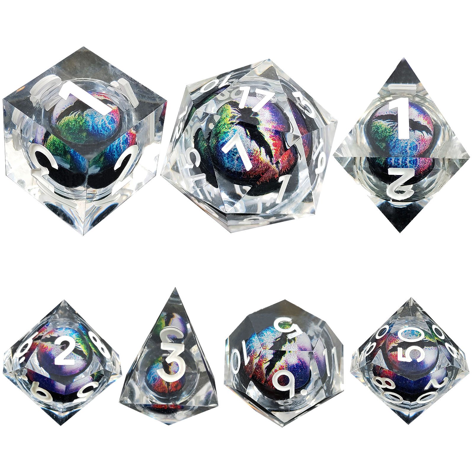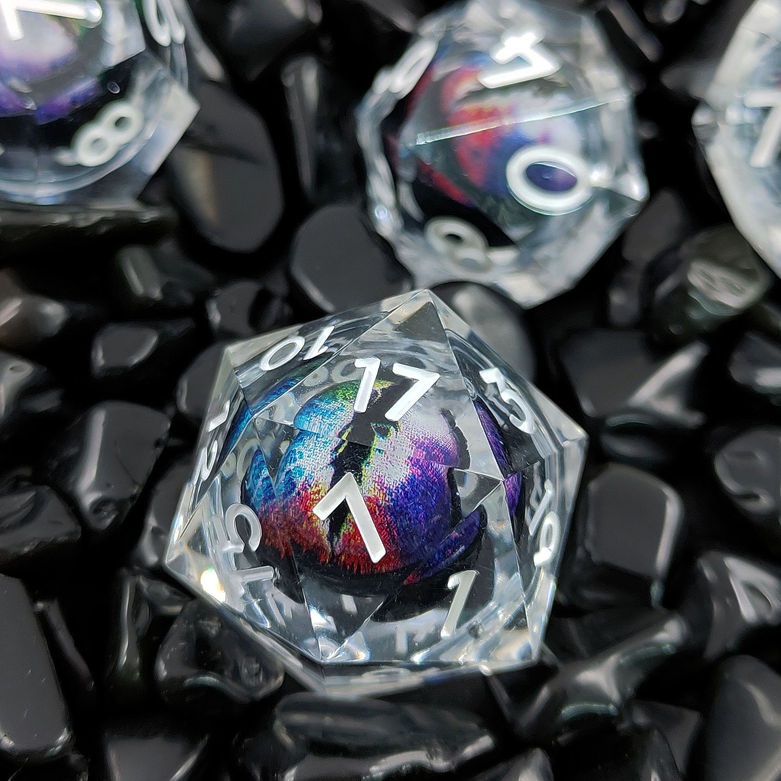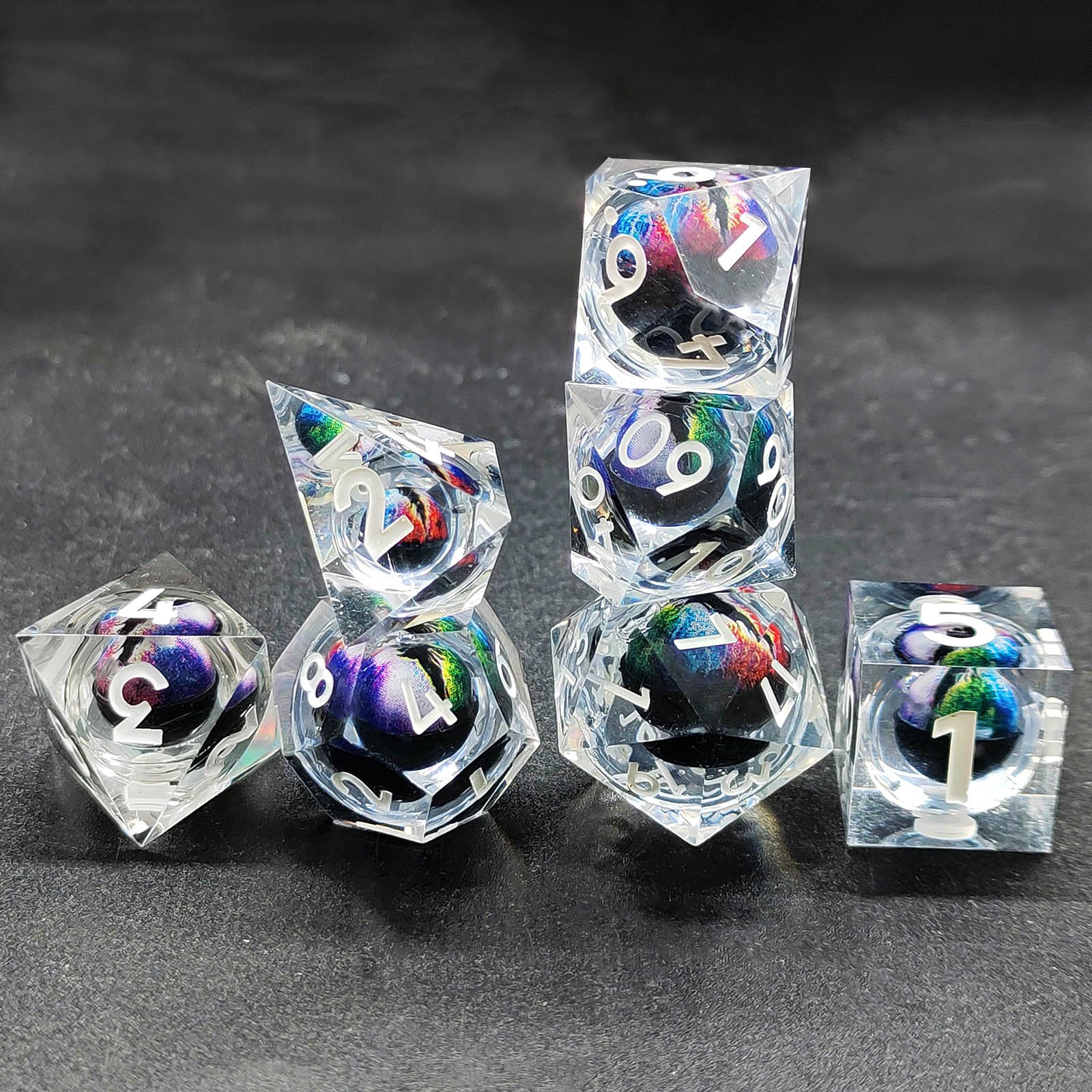 Unique Dragon Core Inclusion: Each transparent die encases a vibrant, multi-color “Dragon Eye” core. This internal inclusion creates a stunning, dynamic 3D effect, glittering with a mesmerizing holographic/iridescent sheen.