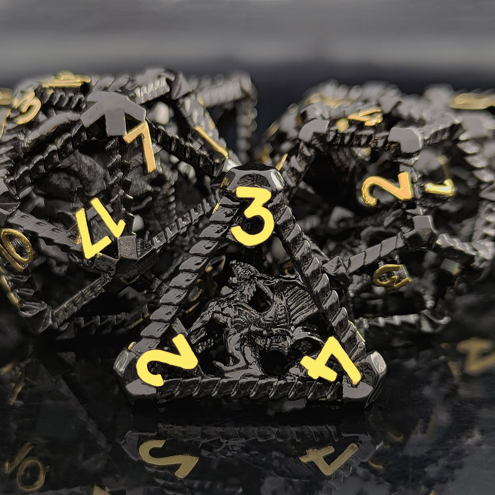 The black yellow version combines a dark metal frame with bright yellow numbers for maximum contrast. The open frame reveals the center dragon figure, giving the dice a sharp and bold fantasy look. High contrast numbering makes results easy to read in fast sessions or low light conditions. The zinc alloy construction keeps weight consistent and rolls stable. This style is a strong choice for darker themed characters and for retailers who need a high visibility color option with bulk order support.