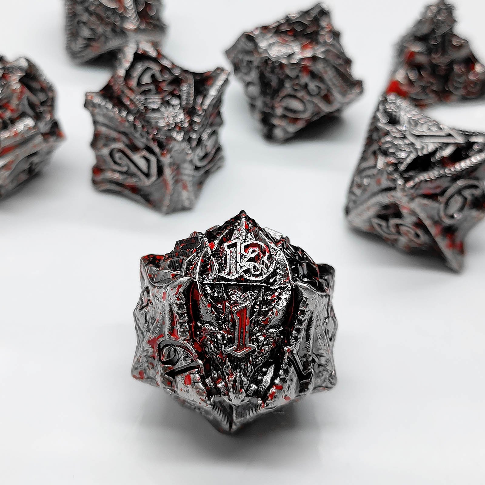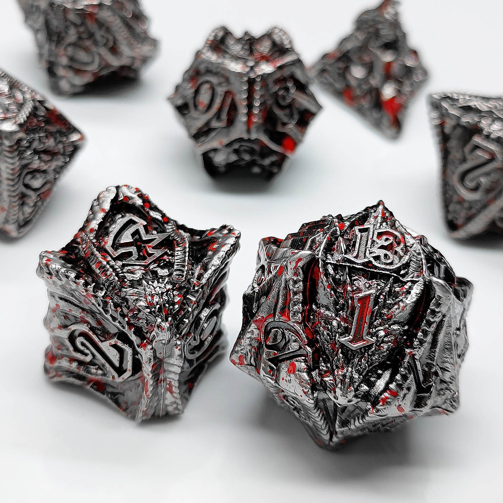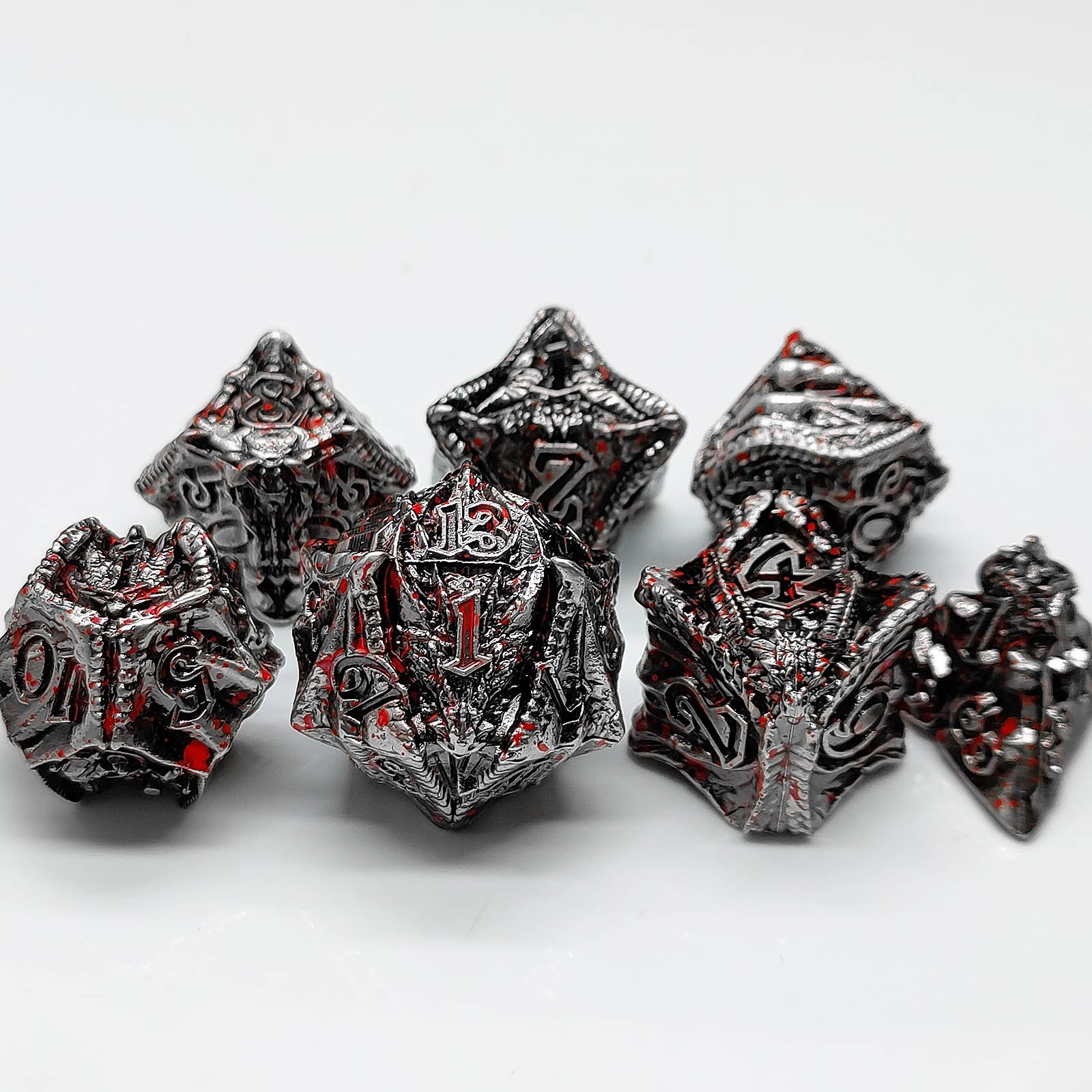 This metal dragon dice set is designed for players who want solid weight and strong table presence. Each die features a sculpted dragon motif with deep-cut faces for clear readability. The silver metal with red blood splatter effects adds a bold fantasy style that works well for DND, Pathfinder, and other tabletop RPG systems. Suitable for collectors, game stores, and bulk buyers looking for factory-direct metal DND dice.