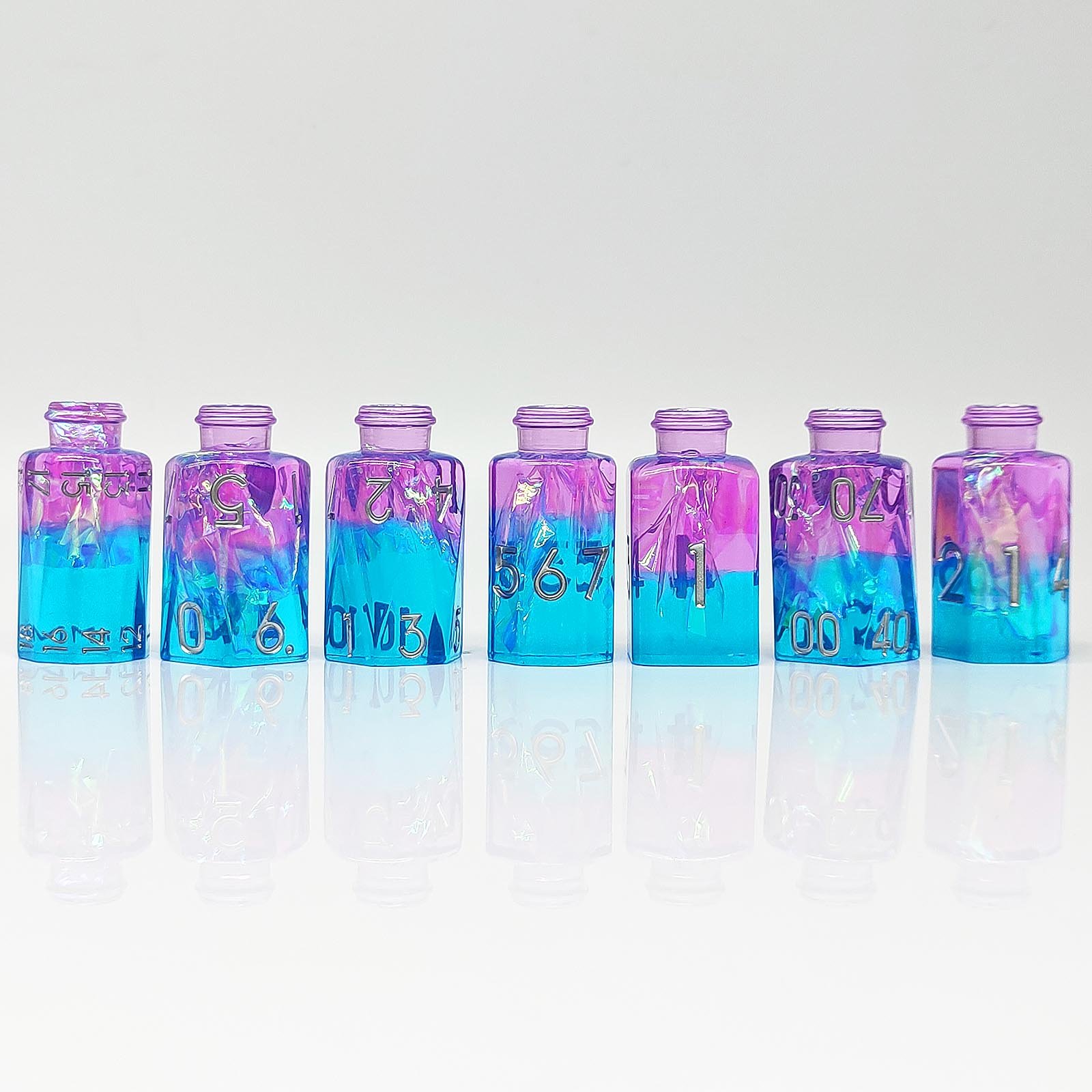 This pink–blue potion bottle resin dice set looks like a ring of miniature elixirs laid out on the table. Each die is cast in clear resin with a gentle shift from cotton-candy pink to icy blue, wrapped around iridescent shards that catch the light from every angle. The bottle silhouette rolls cleanly while still feeling like a display piece, and the crisp white numbers stay legible against the soft pastel gradient.